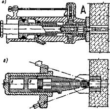 Рис. 75. Схема гидродомкратов для натяжения арматуры: а - для стержневой арматуры; б - для пучковой арматуры Гидродомкрат для натяжения стержневой арматуры (рис. 75, а) надевают стороной А на арматурный стержень, заканчивающийся резьбой, и вручную навинчивают на него шток, после чего через штуцер нагнетают масло в полость домкрата. Существуют также гидродомкраты для натяжения пучковой и тросовой арматуры, при помощи которых можно натягивать одновременно все проволоки или канаты пучка (рис. 75, б, табл. 22). Их называют также домкратами двойного действия, так как они одновременно производят вытягивание пучка и задавливание пробки в конусный анкер. Таблица 22 Техническая характеристика гидравлических домкратов для предварительного натяжения арматуры