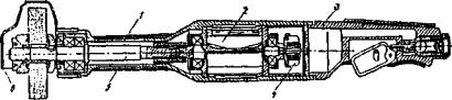 Рис. 76. Пневмошлифовальная ручная машина: 1 - корпус; 2 - пневмодвигатель; 3 - рукоятка; 4 - регулятор числа оборотов; 5 - шпиндель; 6 - кожух