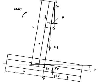 Рис. 80. Схема к проверке остойчивости плавучей системы Остойчивость плавучей системы определяется следующими условиями (рис. 80): а) метацентрическая высота ρ - α должна быть положительной ни всех расчетных случаях, т.е. где ρ - метацентрический радиус, равный расстоянию между центром тяжести вытесненного объема воды (центром водоизмещения Zv) и метацентром Zm, расположенным в точке пересечения вертикали, проходящей через смещенный центр водоизмещения, с осью О-О плавучей системы; а - расстояние от центра тяжести плавучей системы Za до центра водоизмещения Zv, принимаемое равным тому же расстоянию при начальном положении плавсистемы. б) при крене и дифференте плавучей системы от действия расчетной ветровой нагрузки кромка палубы в любой точке не должна уходить под воду, а днище (середина скулы) не должно выходить из воды. При проверке остойчивости все нагрузки должны приниматься расчетные. Значение коэффициента надежности по нагрузке для собственного веса плашкоута с обстройкой и оборудованием следует принимать в их невыгодном значении (0,9 или 1,1). Значение метацентрического радиуса определяется по формуле где I - момент инерции площади плашкоута (баржи) в уровне ва терлипии относительно оси наклонения плавучей системы, принимаемый при кренах - относительно оси с меньшим моментом инерции, а при дифферентах - относительно оси с бульшим моментом инерции площади; Σin - сумма собственных моментов инерции поверхности балласта в понтонах (отсеках барж) относительно осей, проходящих через центры тяжестей этих поверхностей, параллельно осям наклонения плавучей системы; ΣVp - объем (водоизмещение) погруженной части плавсистемы. Осадку плавучей системы от вертикальных нагрузок определяют по формуле где ΣQ - расчетная (или нормативная - см. ниже) нагрузка, приходящаяся на плавсистему; kв - коэффициент полноты водоизмещения, принимаемый для понтонов типа КС равным 0,97; Ω - площадь плашкоута по ватерлинии. Осадка барж определяется по паспортным данным в зависимости от расчетной нагрузки на баржу. Для контроля за фактической осадкой плавучих систем в рабочих чертежах должны указываться осадки от нормативных нагрузок. Максимальная осадка от расчетных нагрузок, вызывающих крен или дифферент плавучей системы, определяется по формуле где b - половина размера плашкоута; φ - угол крена или дифферента. Для плавучих систем рассматриваемого типа угол крепа или дифферента можно рассчитать по формуле где ΣМп - расчетный момент от постоянных нагрузок; ΣMвр - расчетный момент от временных нагрузок; m - коэффициент условий работы, принимаемый равным 1,2. Расчетный момент ΣМп от постоянных нагрузок принимается относительно осей симметрии площади плашкоута (при полном уравновешивании веса кранов или копров ΣМп = 0). Расчетный момент ΣМвр принимается от горизонтальных ветровых нагрузок относительно центра водоизмещения. Сюда же входят неуравновешенные части вертикальных нагрузок (веса груза на крюке крана, сваи на стреле копра и т.п). Угол φ должен удовлетворять условиям: где φ1 и φ2 - угол крена (дифферента), соответствующий началу входа кромки палубы в воду и выходу из воды днища (середины скулы). Расчет на прочность корпуса судна производят с использованием линий влияния изгибающих моментов М и поперечных сил Q. Ординаты линий влияния определяются из общих вы