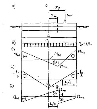 где v=(ρ-a)/ρ=1-a/ρ. В этих формулах первые члены учитывают изменение усилий за счет дифферента плавсистемы. Второе слагаемое формул образуется за счет эпюры qp - сил поддержания воды при центральном загружении плавсистемы силой Р = 1. Третий член учитывает непосредственное воздействие силы Р = 1 или момента, ею создаваемого М = 1·хр, и действителен только при положении единичной силы левее сечения, для которого строится линия влияния. Анализ формулы (48) показывает, что наибольшие изгибающие моменты в сечении корпуса под сосредоточенным грузом действуют при хп = 0, т.е в миделе судна (см. рис. 81, г). Для любого числа сосредоточенных грузов Р, на палубе изгибающий момент от них в среднем сечении корпуса будет выражен формулой