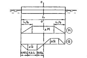 Рис. 81. Линии влияния для плавучей системы: а - расчетная схема; б - эпюра сил поддержания воды; линии влияния: в - МL/3; г - М0; д - QL/3 где хi - абсолютная величина расстояния от миделя до точки приложения нагрузки Рi. Из анализа формулы (49) следует, что ординаты линии влияния Q0 в миделе равны ±0,5, а по концам плашкоута (при хn = L/2) равны нулю. Изложенная методика расчета судна на прочность относится к его положению на спокойной воде. Кроме этого, необходимо учитывать дополнительные изгибающие моменты ΔМ и поперечные силы ΔQ от волновой нагрузки: где k6 - коэффициент полноты водоизмещения; В - ширина плашкоута в уровне ватерлинии по миделю; L - длина плашкоута в уровне ватерлинии; h - расчетная высота волны во время работы, м. Расчетную высоту волны принимают на основании данных местного пароходства и в расчете берут не менее 0,6 м. Коэффициент k0 вычисляется по формуле k0 = 1,24-2B/L. (53) Коэффициент k1 в зависимости от длины судна L принимается равным при длине судна 20 м - 0,0123; при длине судна 40 м - 0,0101; при длине судна 60 м - 0,0085; при длине судна 100 м - 0,0061. Коэффициент k2 вычисляется по формуле k2 = 2-20Tн/L, (54) где Тн - осадка судна носом, м. Эпюры дополнительных усилий в корпусе плашкоута от волновых воздействий изображены на рис. 82.