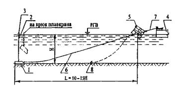 Рис. 83. Схема якорного закрепления плашкоута: 1 - железобетонный якорь-присос; 2 - строп; 3 - якорный буй; 4 - плашкоут; 5 - якорный плот с плавучим рымом; 6 - папильонажный канат; 7 - якорный канат (расчалка); 8 - весовой якорь (положение до сростки якорного и папильонажного каната) Коэффициент