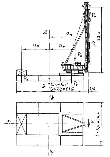 Рис. 84. Общий вид и расчетная схема плавучей системы с копром РМ-20 на 12 понтонах КС-63 (к примеру 5) Для установки копра примем плашкоут из 12 понтонов КС-63 (3×4 шт.) размерами в плане 21,6×14,4 м, высотой борта 18 м (рис. 84). Определим необходимый вес противовеса (регулировочного сухого балласта) исходя из условия, чтобы при копре с подвешенным молотом в рабочем состоянии (свая установлена в направляющие, ее вес не действует на копер) стрела копра была вертикальной, т.е. дифферент плавсистемы равен нулю: ΣМz = 0; Рп·aп-Рк·ак-Рм·ам-Рр·ар = 0, где Рр = 40 кН - вес металлической рамы под копер. Отсюда Рп = (Рк·ак+Рм·ам+Рр·ар)/ап = (392×8,0+61,8×12,4+40×7,2)/9,0 = 466 кП. Принимаем противовес из железобетонных плит объемом Vп = 466/(9,81×2,4) = 20 м3. Определим полный вес плавсистемы: вес понтонов - Qп = (6,28+0,52)×9,81×12 = 800 кН; вес остаточного балласта - Qo.б. = 21,6×14,4×0,1×9,81×1,0 = 305 кН; веса копра с рамой, молота и сваи указаны выше. ΣQ = 800+305+466+392+61,8+40+35 = 2100 кН. Проверим плавсистему на плавучесть по формуле (41): γΣVп = 1,0×9,81×12×45×0,9 = 4767 кН, где γf = 0,9 - коэффициент надежности по нагрузке; ΣQkн = 2100×2,0×1,1 = 4620 кН, где γf = 1,1 - также коэффициент надежности по нагрузке. Условие (41) выполняется, т.е. γΣVп > γΣkн. При расчете плавсистемы на остойчивость вначале по формуле (44) определим среднюю осадку плашкоута: tв = 2100×1,1/(0,97×21,6×14,4×9,81) = 0,78 м. Положение центра тяжести плавсистемы найдем из уравнения суммы статических моментов всех сил относительно уровня днища плашкоута: а = (800×0,9+305×0,05+466×2,3+392×7,0+61,8×16+40×2,1+35×8,0)/2100-0,78/2 = 2,42 м. Моменты инерции плашкоута относительно осей х и у равны: Iх = 21,6×14,43/12 = 5374 м4; Iу = 14,4×21,63/12 = 12093 м4. По формуле (43) определяем метацентрические радиусы (так как балластируемых понтонов в данном случае нет, Σin = 0): ρх = 5374/235,3 = 22,8 м; ρу = 12093/235,3 = 51,4 м, где ΣVp = 21,6×14,4×0,78×0,97 = 235,3 м3. Проверяем остойчивость плавсистемы по условию (42): ρmin-а = 22,8-2,42 = 20,38 м > 0, т.е. остойчивость обеспечивается. Далее рассчитаем углы крена и дифферента плавсистемы по формуле (46). При этом имеем в виду, что поперечный крен постоянной нагрузкой не вызывается. Согласно СТП 136-99 [25] нормативная ветровая нагрузка для IV ветрового района составляет w0 = 0,48 кН/м2. Значения коэффициента k, учитывающего изменение ветрового давления по высоте от уровня воды, составляют: для плашкоута - 0,75; для копра - 1,0; для стрелы, молота, сваи - 1,25. Аэродинамические коэффициенты для всех элементов, имеющих в данном случае сплошное прямоугольное сечение, с = 1,4. Значения средней ветровой нагрузки, действующей поперек плавсистемы (без пульсационной составляющей, которая в данном случае не известна): на плашкоут - W1 = w0kc = 0,48×0,75×1,4×21,6×(1,8 - 0,78) = 11,2 к11; на копер - W2 = 0,48×1,0×1,4×7×4 = 18,8 кН; на стрелу - W3 = 0,48×1,25×1,4×1,0×22 = 18,5 кН; на молот - W4 = 0,48×1,25×1,4×145 = 4,2 кН; на сваю - W5 = 0,48×1,25×1,4×0,35×12 = 3,5 кН. Сумма моментов от поперечных ветровых нагрузок (рис. 85): ΣМвр = 11,2×(1,8-0,78)/2+18,8×3+18,5×12+4,2×15++ 3,5×6,5 = 370 кН·м. По формуле (46):