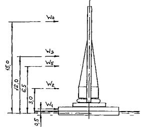 Рис. 85. Расчетная схема действия ветровой нагрузки при расчете плавсистемы на устойчивость Значения средней ветровой нагрузки, действующей вдоль плавсистемы: на плашкоут - W1 = 14,4×11,2/21,6 = 7,5 кН; на копер - W2 = 5×18,8/7 = 13,4 кН; на стрелу - W3 = 18,5 кН; на молот - W4 = 0; на сваю - W5 = 0. Сумма моментов от постоянных нагрузок: ΣМп = -466×0,9×9+(392×8+61,8×12,4+40×7,2)×1,1 = 837,5 кН·м. Сумма моментов от временных нагрузок (включающих ветровые нагрузки и вес сваи): ΣМвр = 7,5×(1,8-0,78)/2+13,4×3+18,5×12+3,5×12,4×1,1 = 313,8 кН·м. По формуле (46):