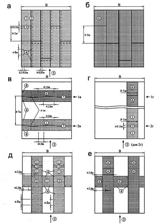 Примечание. Меньшие значения могут быть приняты при гарантированном допуске изменения толщины укладываемого слоя (слоев) в пределах ±1 см. 5.6 Основные области применения конструктивных решений с устройством армирующей прослойки в слоях асфальтобетонного покрытия: а) усиление существующего блочного асфальтобетонного покрытия при наличии частых поперечных трещин, сетки трещин (применяется сплошное армирование по рис. 2 а, б); б) усиление существующего покрытия с армированием в зоне поперечных трещин или швов (применяется при расстоянии между поперечными трещинами или швами более 7 м по рис. 2в); в) усиление существующего покрытия с армированием в зоне продольных трещин или швов (применяется при наличии систематического проявления продольных трещинах по рис. 2 г); г) устройство новой дорожной конструкции со сплошным армированием покрытия при предполагаемом появлении трещин (наличие основания из материалов, укрепленных цементом - по рис. 2 а, б); д) устройство новой дорожной конструкции, имеющей жесткую дорожную одежду - асфальтобетонное покрытие на бетонном основании с армированием в зоне продольных и поперечных швов по рис. 2 д, е); е) в зоне сопряжения старой и новой дорожных конструкций при уширении проезжей части автомобильной дороги (2.3) (по рис. 2 г). 5.7 При применении решения по усилению покрытий армирующими прослойками должна учитываться необходимость тщательного выполнения всех операций технологии производства работ, прежде всего, в части розлива вяжущего с необходимым расходом (п. 6 настоящего стандарта), необходимость обязательного соблюдения требований табл. 3 настоящего стандарта в части минимальных толщин слоев, а также ограничения по применению геокомпозитов с полотнами марки К2 - наличие продольных уклонов более 30 ‰, в местах изменения скорости транспортных средств (регулируемые перекрестки, автобусные остановки).