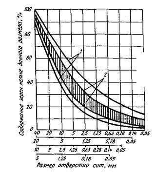 Рис. 2. Непрерывные зерновые составы щебеночно (гравийно)-песчаных смесей: 1 - Ксб =0,6÷0,8: 2 - Ксб =0,55÷0,75