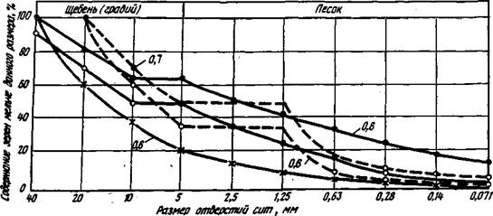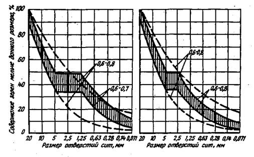 Рис. 1. Непрерывные зерновые составы щебеночно (гравийно)-песчаных смесей с Ксб = 0,6÷0,8