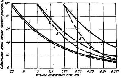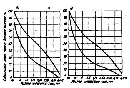 2.1.8. Для приготовления обработанных материалов можно использовать каменные материалы различного петрографического состава - известняки, песчаники, доломиты, шлак, гранит, ракушечники и др. Применение известнякового щебня или щебня из шлаков черной металлургии позволяет уменьшить расход вяжущего на 1-2%. 2.1.9. Использование каменного материала одной горной породы, но более высокой марки позволяет снизить расход вяжущего на 0,5-1% массы смеси. 2.1.10. Для сокращения расхода вяжущего на 2-5% следует применять каменные материалы и пески с непрерывным зерновым составом, соответствующим кривым плотных смесей с коэффициентом сбега 0,65-0,75 (см. рис. 1 и 2). 2.1.11. Для повышения плотности смесей из