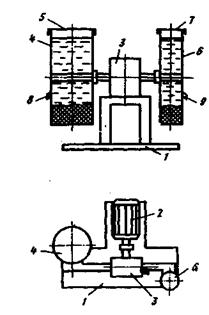 Проверка прибора. В нижнюю часть поплавка 7 устанавливают пустое режущее кольцо 4. К поплавку с помощью трех замков присоединяют сосуд 9 и погружают в воду, налитую в ведро-футляр 3.