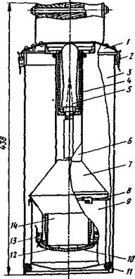 1 - крышка прибора; 2 - замки прибора; 3 - ведро-футляр; 4 - приспособление для отбора проб режущим кольцом; 5 - нож; 6 - трубка со шкалами; 7 - поплавок; 8 - замки сосуда; 9 - сосуд; 10 - тарировочный груз (пластинки); 11 - резиновый шланг; 12 - нижняя крышка; 13 - замки поплавка; 14 - режущее кольцо (цилиндр) с нижней крышкой