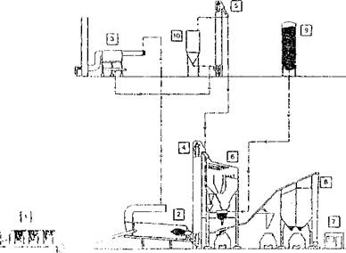 Рис. 1. Схема технологического процесса приготовления литой асфальтобетонной смеси 1. Агрегат питания 2. Сушильный агрегат 3. Агрегат пылеулавливания 4. Горячий элеватор 5. Элеватор минерального порошка и пыли 6. Смесительный агрегат 7. Пульт управления 8. Накопительный бункер 9. Битумоплавильный агрегат 10. Агрегат минерального порошка 3.4. Перед началом процесса приготовления литой асфальтобетонной смеси необходимо проверить исправность термопары в лотке сушильного барабана и убедиться в правильных ее показаниях, проверить дозаторы щебня, песка, порошка, и битума, а также весы. Для обеспечения выпуска литой смеси с требуемой температурой, сушильный барабан, ковши горячего элеватора, отсеки горячего бункера, весовой бункер и мешалку освобождают от остатков минеральных материалов, ранее прошедших подготовку для выпуска стандартных (штатных) смесей, устанавливают требуемый режим нагрева и начинают повторную загрузку минерального материала, в сушильный барабан, его сушку и нагрев. 3.5. Если централизованная поставка битума требуемой марки не предусмотрена, битум изготавливают на АБЗ в соответствующем агрегате по специальному технологическому регламенту. При централизованной поставке битум после выпаривания и нагрева до рабочей температуры перекачивают в расходную емкость и далее в дозатор битума смесительной установки. Битум нагревают до рабочей температуры 160 - 180°С при изготовлении литой смеси I типа; до 150 - 170° С - литой смеси II типа; до 140 - 160° С литой смеси III, IV и V типов. 3.6. Минеральный порошок следует использовать с максимально возможной температурой, что возможно при наличии на асфальтобетонном заводе цеха по производству минерального порошка в составе технологического оборудования асфальтосмесительной установки, или агрегата для его нагрева, а также возможности получения от изготовителя в горячем состоянии. Одновременно, корректируют температуру нагрева минеральных материалов в сушильном барабане. Холодный минеральный порошок, поступающий на АБЗ централизованно по железной дороге или автотранспортом должен быть при заполнении расходного бункера сухим и рыхлым. 3.7. Температуру нагрева минеральных материалов в сушильном барабане при использовании холодного минерального порошка устанавливают в пределах: 320 - 340°С при изготовлении литой смеси I типа; 280 - 300°С - литой смеси II типа; 240 - 260°С - литой смеси III типа; 200 - 220°С - литой смеси IV типа и 300 - 320°С - литой смеси V типа. При введении в мешалку горячего минерального порошка с температурой 120 - 140°С температуру нагрева минеральных материалов снижают на 12 - 14% 3.8. Нагретые материалы сортируют на фракции 0-5; 5 - 15(20) и 15 - 35(40) мм. Материалы, предназначенные для приготовления литой смеси I типа, сортируют на следующие фракции: песчаную - 0-3 мм; и три щебеночные 3-5; 5-10 и 10 - 15 мм. Каждую фракцию дозируют и взвешивают отдельно, согласно запроектированной рецептуре 3.9. При дозировании компонентов литой смеси допускаемая погрешность не должна превышать ±3% по массе для каждой фракции минерального материала (песка и щебня), ±1,5 % по массе для минерального порошка и ±1% по массе для битума. 3.10. Компоненты перемешивают в две стадии: - вначале, все минеральные материалы между собой, а затем, с битумом. Продолжительность перемешивания на каждой стадии устанавливают исходя из конкретного качества мин