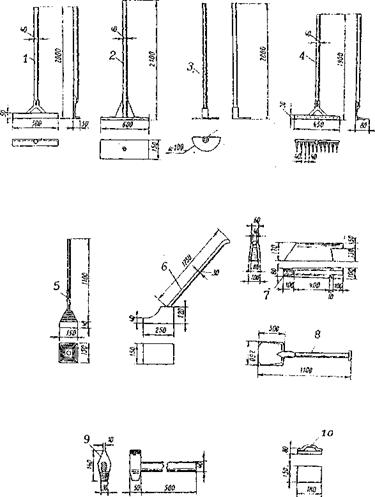 Рис. 4. Инструменты для укладки литой асфальтобетонной смеси 1) Разравниватель смеси, 2) Гладилка, 3) Скребок 4) Грабли, 5) Трамбовка, 6) Утюг, 7) Шпатель (валек), 8) Лопата, 9) Кувалда для забивки костылей (гвоздей, дюбелей), 10) Райбовка (терка). 5.8. Численность: рабочих-асфальтобетонщиков, а также степень их оснащения машинами, механизмами и инструментом определяются типом литой смеси, видом и сменным объемом работ, и рассчитываются на основании карт трудового процесса, в которых по каждому трудовому процессу установлены рациональный состав бригады и способы взаимодействия в ней рабочих. Подготовительные работы 5.9. Состав и последовательность выполнения подготовительных работ определяются видом предстоящих работ (новое строительство, капитальный или текущий ремонты покрытия), временем года состоянием поверхности нижележащего слоя, необходимостью использования подрядчиком специальной техники и т.п. 5.10. Минимальная температура воздуха, при которой разрешается вести строительство, капитальный и текущий ремонты дорожных покрытий с применением литых смесей указана в табл. 11. Таблица 11. ДОПУСТИМАЯ ТЕМПЕРАТУРА ВОЗДУХА ПРИ ВЕДЕНИИ РАБОТ С ПРИМЕНЕНИЕМ ЛИТОЙ АСФАЛЬТОБЕТОННОЙ СМЕСИ