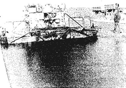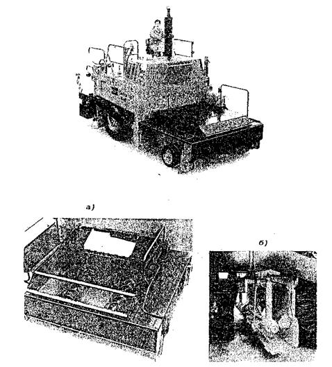 Рис. 5 Строительство покрытия из литой асфальтобетонной смеси I типа на загородной автомобильной дороге а) комплект асфальтоукладочного оборудования на колесно-рельсовом ходу GADF - I. б) рабочий орган асфальтоукладчика для распределения литой смеси на ширину 7,5 м. Технологический процесс состоит из следующих операций: прием и размещение термосов-миксеров по ширине укладываемой полосы; выгрузка литой смеси из термосов-миксеров на основание; распределение смеси; отделка поверхности выглаживающей плитой; распределение черного щебня щебнераспределителем с одновременным втапливанием черного щебня рифлеными вальцами. Прием машин со смесью и процесс распределения ведут непрерывно. Укладку завершают установкой упорного бруса в поперечном направлении. В следующую смену упорный брус снимают, выглаживающую плиту устанавливают на поперечную кромку покрытия, прогревают и укладку продолжают. 5.18. В городе литую смесь I типа укладывают специальным колесным асфальтоукладчиком (рис. 6). Асфальтоукладчик имеет закрытый приемный бункер, рассчитанный на единовременный прием 3,5 тонн литой смеси и подачу ее двумя обогреваемыми винтовыми конвейерами в распределительный отсек переменной ширины (2,5 - 5,0 м). Распределительный отсек представляет собой закрытую по периметру емкость, сблокированную с выглаживающей плитой. В емкости, расположен вал с лопастями, при вращении которого смесь перемешивается и продвигается от середины в обе стороны на ширину укладываемой полосы. Емкость и выглаживающая плита - обогреваемые. Для установки асфальтоукладчика в исходное положение поднимают распределительный отсек и подают асфальтоукладчик задним ходом к началу укладываемой полосы, на которой в поперечном и продольном направлениях заблаговременно устанавливают упорные брусья. С приближением укладчика к поперечному упорному брусу его движение замедляют. Выглаживающую плиту (ее переднюю кромку) совмещают с упорным брусом и осторожно опускают на него. При этом, боковые стенки (щеки) распределительного отсека должны быть также поставлены на упорные брусья, расположенные в продольном направлении. Машинист асфальтоукладчика включает приборы разогрева труб винтового конвейера приемного бункера, распределительного отсека и выглаживающей плиты.