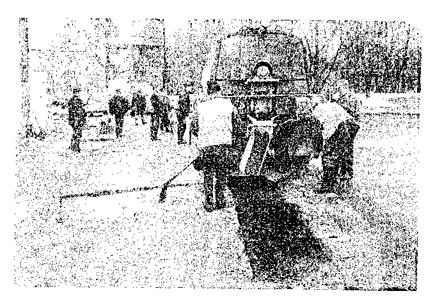 Рис. 9. Ремонт дорожного покрытия литой смесью при помощи термоса-миксера ОРД-1023 5.28. При производстве работ навстречу движения транспорта необходимо принимать дополнительные меры для обеспечения безопасности как работ, так и движения транспорта. Термос-миксер должен работать с зажженными фарами и мигалкой, а впереди, не менее, чем за 10 м от машины - установлен предупредительный знак и место работ ограждено. Распределение и втапливание черного щебня в покрытие производят на картах площадью более 3 м2 сразу после укладки литой смеси. С этой целью специально обученный дорожный рабочий совковой лопатой разбрасывает рассевом в одну щебенку черный щебень из расчета 6-8 кг/м2. Под собственной массой щебень втапливается в покрытие и закрепляется в нем. Невтопившийся щебень после остывания покрытия сметают подметально-уборочной машиной и собирают в ковш погрузчика или в автомобиль-самосвал для повторного использования. Для ускорения ввода в эксплуатацию отремонтированной площади рекомендуется производить искусственное орошение поверхности холодной водой, используя для этой цели поливомоечную машину. По окончании работ технические средства организации движения снимают и открывают движение автомобильного транспорта. Открытие движения транспорта по неостывшему покрытию категорически запрещается. Бригада по ремонту покрытия должна состоять из обученных и опытных рабочих, сработавшихся друг с другом. Бригада должна быть оснащена комплектом инструментов, позволяющим осуществлять все работы от подготовительных до отделки поверхности покрытия и вести контроль за соблюдением проектных отметок. В состав бригады целесообразно включить водителей термосов-миксеров, а также машинистов вспомогательных машин и механизмов, которые в начале смены готовят свои машины к работе (устраняют мелкие неисправности, заправляют машины, производят их регулировку), в процессе работы управляют машинами, а в конце смены очищают машины и сообщают о замеченных неисправностях дежурному механику. В процессе производства работ прораб (мастер) должен вести журнал укладки литой асфальтобетонной смеси по форме, представленной в Приложении 7. Ведение такого журнала способствует повышению качества и облегчает контроль и приемку работ, а также помогает выявить причины последующих дефектов покрытия. 5.31. Организация ремонтных работ как в дневное, так и в темное время суток должна быть построена таким образом, чтобы после их окончания подготовленные к ремонту карты не оставались незаполненными. В целях снижения шума при подготовке ремонтных карт в ночное время в жилых кварталах города пневмоинструмент и асфальтофрезерные машины следует заменить разогревателями асфальтобетона. Образующаяся при этом горячая смесь может быть использована для выравнивания подстилающего слоя или заделки глубоких выбоин. Стоимость ремонта в темное время суток оговаривается с заказчиком отдельно с учетом особенностей условий производства работ, отличающихся от обычных большими трудоемкостью работ, энергозатратами, меньшими производительностью, уровнем безопасности труда и т.п. 5.33. Организация работ на городских эстакадах, мостах, путепроводах и в тоннелях должна учитывать специфику эксплуатации этих инженерных сооружений и особенности движения транспорта по н