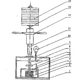 а. прибор для определения глубины вдавливания штампа 1. Опорная плита 2. Термостатирующий сосуд 3. Образец 4. Форма 5. штамп 6. Термометр 7. Маховик установки штампа 8. Крепление ползуна к штоку 9. Упор индикатора 10. Индикатор часового типа 11. Винтовая втулка 12. Муфта загрузки-разгрузки 13. Нагрузочный шток 14. Набор грузов