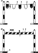 Сигнальные ограждения а) сигнальный шнур с цветными флажками; б) сигнальная лента; 1 - красный цвет, 2 - белый цвет; 3 - шнур; 4. - опора (резиновая).