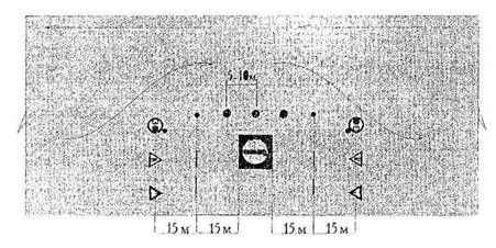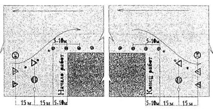 Условные обозначения: • - веха направляющая ● - конус | - барьер штакетный ○ - опора переносная для установки дорожных знаков → - направление движения Рис. 3. Схема расстановки ограждений и дорожных знаков при текущем (ямочном) ремонте асфальтобетонного покрытия при неполном снятии движения транспорта В темное время суток ограждения должны