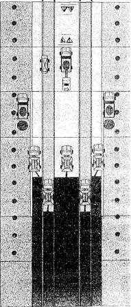Рис. 6. Поперечный профиль проезжей части для совместного движения трамвая и автомобильного транспорта. Черный щебень привозят в автосамосвале и, если позволяют условия, небольшими порциями выгружают в непосредственной близости от подготовленных карт. При отсутствии таких условий весь черный щебень складируют в одном месте, а к ремонтируемой карте подвозят погрузчиком или тачкой. ЭТАП 4. Укладка литой смеси (загрузка транспортного средства на АБЗ, перевозка, распределение, окончательная планировка) Перед загрузкой термоса-миксера смесью необходимо зажечь форсунки, нагреть емкость термоса-миксера до 120-140°С и только после этого включить мешалку. Крышка загрузочного отверстия должна быть открыта не ранее, чем за 5 минут до загрузки термоса-миксера. Общее время перемешивания смеси в термосе-миксере должно быть не менее 20 минут. В процессе транспортирования смесь должна непрерывно перемешиваться, а ее температура - поддерживаться на уровне 200 - 220°С. Доставка литой смеси производится навстречу движения ремонтно-строительного потока. Прием машины на объекте работ осуществляет специально выделенный опытный рабочий-сигнальщик с красной повязкой, который обязан проверить наличие паспорта на поступившую смесь, удостоверяющего качество смеси, ее температуру и количество. При проведении работ необходимо соблюдать следующие правила: литая смесь должна иметь температуру не