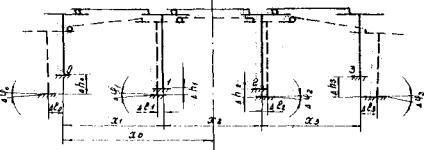 Рис. 1. К определению расчетных перемещений основания под фундаментами опор 2.3.Характер распределения и величины дополнительных усилий в конструкциях путепроводов, обусловленные неравномерными деформациями основания, зависят от жесткостных характеристик опор и основания, изменения этих величин во времени, типов фундаментов и опорных частей. 2.4. Для путепровода с разрезными пролетными строениями, опирающимися одним концом через шарнирно-неподвижные, а другим через шарнирно-подвижные опорные части, продольные усилия Xi и значение х0 определяют решением статически неопределимой рамы (рис. 2).