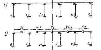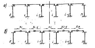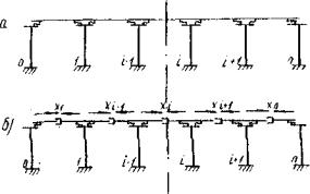 Рис. 3. К расчету путепровода с деформируемыми опорными частями а - расчетная схема; б - основная система метода сил 2.16. Продольные усилия Xi в путепроводах с разрезными пролетными строениями, опирающимися обоими концами через деформируемые опорные части (см. рис. 3), рекомендуется определять с учетом фактора времени решением системы уравнений (4), в которой единичные перемещения δi(i-1) и δi(+1) для промежуточных опор определяются по формулам (5), (7), (12), а величина δii - по формуле где A'ti - величина, определяемая по формуле f'ti - безразмерный коэффициент, определяемый из выражения