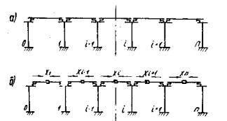 Рис. 2. К расчету путепровода с шарнирными опорными частями а - расчетная схема; б - основная система метода сил Система уравнений содержит канонические уравнения метода сил и дополнительное уравнение, определяющее ЦДС относительно нулевой опоры 2.5. Единичные перемещения определяют по формулам: δii = δ0i-1+δ0i; (6) где δ0i-1 и δ0i - горизонтальные перемещения верха (i-1)-й и i-й опор от единичной горизонтальной силы. 2.6. Единичное перемещение верха промежуточной опоры δ0i определяют по формуле где u0ci - перемещение, обусловленное изгибом стоек, определяемое по формуле u0ri - перемещение, обусловленное податливостью основания, определяемое по формуле (10) для опор с фундаментами на естественном основании и (11) - для опор со свайными фундаментами: