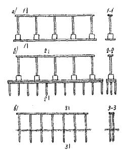 Рис. 6. Многостоечные опоры путепроводов а - с фундаментами на естественном основании; б - со свайными фундаментами; в - свайные 3.3. Расчет опор рекомендуется производить в два этапа. На первом этапе, используя принцип начала возможных перемещений, определяют, с учетом деформативности опоры и основания, значения реактивного отпора грунта по формуле