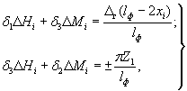 где hp - высота свайного ростверка. В обоих случаях значения R3p - R4р = 0. В формулах (80) и (82) второе слагаемое учитывается только в опорах со свайными фундаментами, где ΔМ1 и ΔH1 - дополнительные изгибающий момент и поперечная сила в голове крайней сваи, вызванные горизонтальными деформациями основания и определяемые в первом приближении без учета изгиба ростверка решением системы уравнений: