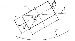 Рис. 7. К определению вертикальных перемещений пролетных строений при искривлении основания 1 - пролетное строение; 2 - нормаль к образующей кривизны земной поверхности 4.2. Значение тангенса угла поворота ригеля относительно его нулевой точки, лежащей на нормали к образующей кривизны земной поверхности, определяют по формуле где В - ширина пролетного строения; α - угол между продольной осью и диагональю пролетного строения, вычисляемый по формуле