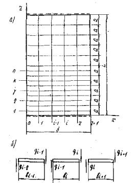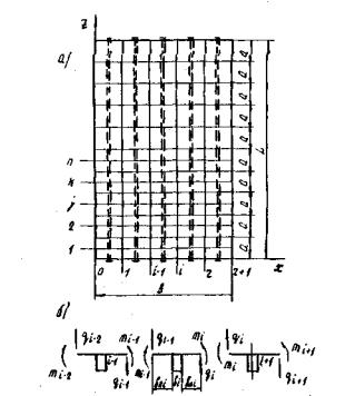 Рис. 8. Схема расчета ребристого пролетного строения а - план; б - поперечное сечение 4.6. В системе канонических уравнений (98) коэффициентами при неизвестных являются перемещения основной системы, вызываемые единичными силами и моментами, действующими по направлениям отброшенных связей. Численные значения этих коэффициентов определяют по формулам: αjk1;= θjki(0,5bi+bni); (110) αjk3 = -θjki+1(0,5bi+1+bn(i+1)); (112) bjk1;= -fjki+θjki(0,5bi+bni)2; (113)