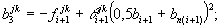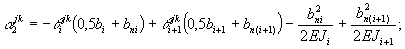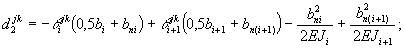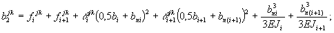 с1jk = -θijk; (116) с3jk = -θi+1jk; (118) d1jk = -θjki(0,5bi+bni); (119) d3jk = θjki+1(0,5bi+1+bn(i+1)); (121) где α1jk - линейное перемещение в поперечном сечении j по направлению силы qij от момента mki-1, действующего в поперечном сечении k; a2jk - то же, от момента mki = 1; a3jk - то же, от момента mki+1 = 1; b1jk - то же, от силы qki-1 = 1, действующей в поперечном сечении k; b2jk - то же, от силы qki = 1; b3jk - то же, от силы qki+1 = 1; c1jk - угол поворота в поперечном сечении j по направлению момента mji от момента mki-1 = 1, действующего в поперечном сечении k; c2jk - то же от момента mki = 1, c3jk – то же от момента от момента mki+1 = 1; d1jk - то же, от силы qki-1 = 1, действующей в поперечном сечении k; d2jk - то же, от силы qki = 1; d3jk - то же, от силы qki+1 = 1; fijk - вертикальное перемещение в см i-й балки в произвольном поперечном сечении j от вертикальной единичной силы, действующей в k-м сечении, определяемое с учетом кососимметричности расчетной схемы по формуле