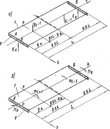 где α1jk - линейное перемещение в сечении j по направлению силы qij от qi-1k = 1, действующей в поперечном сечении k (учитываются податливость опорных частей, прогиб и закручивание балочной плиты); α2jk - то же, от силы qik = 1; α3jk - то же, от силы qi+1k = 1; fijk - вертикальное перемещение i-й балочной плиты в произвольном поперечном сечении j от единичной силы, приложенной в k -м сечении, определяемое с учетом кососимметричности расчетной схемы согласно п. 4.9; θijk - то же, угол поворота от единичного закручивающего момента, определяемый согласно п. 4.10; Δij - взаимное смещение примыкающих продольных граней i-й и (i+1)-й балочных плит в точке пересечения сечений i и j при неравномерном оседании опорных частей, определяемое согласно п. 4.11. 4.9. Вертикальное перемещение i-й балочной плиты в произвольном поперечном сечений / от единичной силы, приложенной в k-м сечении (рис. 10,а), определяют по формуле fijk = fi,0jk+fi,ujk, (135) где fi,0jk - перемещение от деформации опорных частей, вычисляемое при ленточных и точечных деформируемых опорных частях соответственно по формулам: