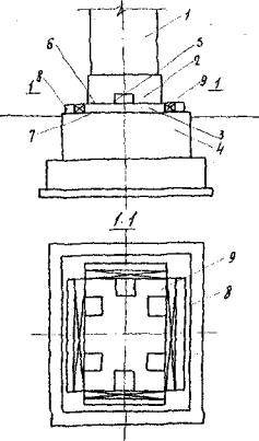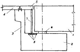 Рис. 11. Конструкция деформационного шва на устое 1 - пролетное строение; 2 - ригель; 3 - шкафная стенка; 4 - переходная плита; 5 - заменяемая плита; 6 - опорная часть; 7 - переставные стойки; 8 - отверстия для фиксации стоек 5.15. Для железнодорожных путепроводов на подрабатываемых территориях рекомендуется применение массивных опор, включающих средства регулирования, обеспечивающие возможность устранения крена опор и компенсации горизонтальных смещений основания. 5.16. Конструкция регулируемой опоры показана на рис. 12. Опора 1, жестко связанная с подколенником 2, опирается на опорную пяту 3, свободно лежащую на поверхности фундамента 4. По периметру подколенника со стороны, прилегающей к опорной пяте, устраивают ниши 5 для размещения гидравлических домкратов, служащих для рихтовки опоры по вертикали с целью устранения крена. Возможность отделения подколонника от опорной пяты достигается устройством между ними разделительного шва 6. Между прилегающими поверхностями опорной пяты 3 и обреза фундамента 4 выполняют шов скольжения 7. Для фиксации пяты от горизонтальных смещений при эксплуатации путепровода используют консольные упоры 8 и инвентарные железобетонные вкладыши 9. При необходимости рихтовки опоры по горизонтали вкладыши 9 удаляют, а в пространстве между боковыми поверхностями опорной пяты и консольными упорами горизонтально размещают гидравлические домкраты.
