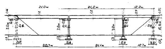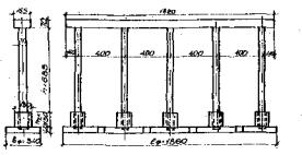 При определении продольных усилий Xi с учетом фактора времени следует руководствоваться требованиями п. 2.11. 2.29. Результирующие горизонтальных усилий, действующие на опорные части, не должны превышать предельных значений, определяемых по формуле (34). В противном случае переходят на опорные части с большей податливостью или применяют разгрузку (см. разд. 5). 2.30. При расчете на неравномерные вертикальные перемещения основания Δhi пролетные строения рассчитывают как неразрезные балки на упругих опорах.* _________________________ * Клепиков С.Н. Расчет конструкций на упругом основании, Киев: Вудiвельник,1967. 2.31. Рекомендуется выполнять проверку правильности решения системы уравнений (4). Полученные значения неизвестных должны удовлетворять уравнениям: при расчете путепровода по п. 2.4 δnXn+Δn=0; (58) при расчете путепровода по п. 2.15 при расчете путепроводов по п.п. 2.20, 2.27 (δn + δpn)Xn+Δ = 0. (60) 3. РАСЧЕТ ОПОР3.1. Многостоечные опоры путепроводов (рис. 6) рекомендуется рассчитывать как статически неопределимые рамы на неравномерно деформируемом основании. 3.2. Расчет опор с фундаментами на естественном основании на воздействие горизонтальных деформаций производят согласно требованиям Руководства по проектированию зданий и сооружений на подрабатываемых территориях. Башенные, транспортные и заглубленные сооружения, трубопроводы (Донецкий Промстройниипроект, НИИСК, Донецк, 1982), а на воздействие кривизны - в соответствии с требованиями настоящих Рекомендаций. Дополнительные усилия в многостоечных опорах со свайными фундаментами определяют с учетом совместного влияния горизонтальных деформаций и кривизны.