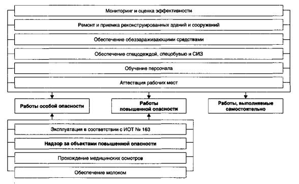 ЛОКАЛЬНЫЕ ДОКУМЕНТЫ ПО ОХРАНЕ ТРУДАСтандарт предприятия СТП 581-6.7-002-2006, утв. генеральным директором ОАО "РПЗ" СУОТ. Идентификация опасностей, оценка и контроль рисков*____________ * Стандарты разработаны коллективом отдела охраны труда ОАО "РПЗ". ВведениеВ рамках системы управления охраной труда ОАО "РПЗ" разработан СТП 581-6.7-002-2006 "Идентификация опасностей, оценка и контроль, включающий: - Процесс проведения оценки рисков на рабочих местах в ОАО "РПЗ", разработанный на основе подхода стандарта BS 8800-2004 "Системы менеджмента профессиональной безопасности и здоровья. Руководство"; - Процесс проведения аттестации рабочих мест по условиям труда, определенный постановлением Минтруда России от 14.03.97 № 12 в качестве методики оценки рисков на рабочих местах в организациях Российской Федерации. Процессы проведения оценки рисков не противоречат положениям аттестации рабочих мест по условиям труда и с целью повышения безопасности производства и наиболее эффективного управления рисками осуществляются параллельно. 1. Область применения1.1. Настоящий стандарт распространяется на все структурные подразделения и устанавливает требования к процессам: - проведения идентификации опасностей, оценки рисков и контроля рисков, связанных с безопасностью во всех структурных подразделениях, в соответствии с требованиями OHSAS 18001-1999 и ГОСТ Р 12.0.006-2002; - проведения аттестации рабочих мест по условиям труда, установленного в Российской Федерации в качестве методики оценки рисков на рабочих местах. 1.2. Цель процессов - определение видов опасностей, рисков в области охраны труда, которые могут привести к возникновению ЧС, несчастных случаев, профессиональных заболеваний на предприятии; контроль выявленных рисков. 2. Нормативные ссылкиВ настоящем стандарте использованы ссылки на следующие нормативные документы. OHSAS 18001-1999 "Система менеджмента профессиональной безопасности и здоровья" (с изменением 1-2002). BS 8800-2004 "Системы менеджмента профессиональной безопасности и здоровья. Руководство". ГОСТ Р 12.0.006-2002 "Общие требования к системе управления охраной труда в организации". ГОСТ 12.0.004-90 "Организация обучения безопасности труда. Общие положения". РК ИЛ ООТ-01.1.04 "Руководство по качеству испытательной лаборатории отдела охраны труда". СТП 581-6.7-003-2006 "СУОТ. Планирование программ СУОТ". СТП 581-6.7-004-2006 "СУОТ. Обучение персонала, специалистов и руководителей безопасным методам работы". СТП 581-6.7-006-2006 "СУОТ. Оперативный контроль". СТП 581-6.7-008-2006 "СУОТ. Мониторинг и оценка эффективности СУОТ". Инструкция по охране труда при выполнении работ повышенной опасности № 163. Ведомость государственных стандартов системы стандартов безопасности труда. 90Е.045.062. Трудовой кодекс Российской Федерации (ст. 212 "Обязанности работодателя по обеспечению безопасных условий и охраны труда", 221 "Обеспечение работников средствами индивидуальной защиты"). ПОТ РО 14000-005-98 "Работы с повышенной опасностью. Организация проведения". Федеральный закон от 21.07.97 № 116-ФЗ "О промышленной безопасности опасных производственных объектов". Постановление Минтруда России от 31.03.03 № 13 "Об утверждении Норм и условий бесплатной выдачи молока или других равноценных пищевых продуктов работникам, занятым на работах с вредными условиями труда". Постановление Минтруда России от 29.10.99 № 39 "О внесении изменений и дополнений в Правила 
