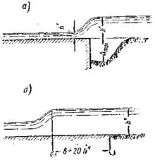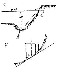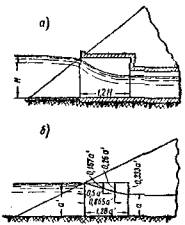 ωср - площадь срезки. Срезку делают под уровень, при котором ее действительно можно сделать (на 0,5 - 1,0 м выше средней, но не низкой межени). Уклон срезки вдоль реки должен равняться уклону реки. Общая площадь срезки и размыва не должна превышать 0,4 бытовой площади под мостом для судоходных рек и 0,5 для несудоходных рек. Размыв в пределах срезки допускают на общих основаниях, как в остальной части отверстия. Срезку можно делать при прямом участке русла (длиной в 2 - 3 отверстия моста) и при криволинейном участке. В последнем случае срезка делается с вогнутой стороны реки, так как срезка, сделанная на выпуклой стороне, может заноситься в результате поперечной циркуляции потока и потому нерациональна. Срезку делают не только под мостом, но и выше и ниже моста в виде широкого разворота, чтобы поток мог войти с расчетной средней скоростью и после беспрепятственно выйти, так как иначе срезка нормально работать не будет. Средняя глубина после размыва (рис. 16, а): hр = Ph, где P - коэффициент размыва; h - глубина до размыва.