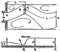 Рис. 6. Схема несвободного протекания воды под мостом При бытовой (естественной) глубине h ≤ hк установится свободное истечение; при h > hк истечение будет несвободным (hк - критическая глубина в подмостовом сечении1). 1