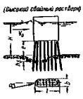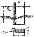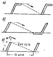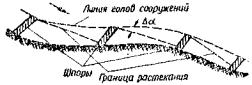 Продольные валы с капитальными поперечными струеотбойными сооружениями (шпорами). На участках вблизи моста шпоры располагают перпендикулярно к течению, дальше - под углом до 30 - 40°. При больших углах наклона или малом расстоянии между шпорами им придают Г-образную форму (рис. 22, а) или крепят часть протяжения продольных валов у корней шпор с верховой стороны от них как указано на рис. 22, б. Расстояние между шпорами назначают по рис. 22, в.