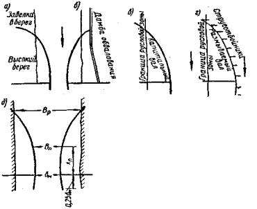 Максимальная возможная глубина после размыва на немеандрирующих реках (рис. 16, б): Если в русле имеются обнажения коренных (неразмываемых) пород, то фактический коэффициент размыва (рис. 16, в):