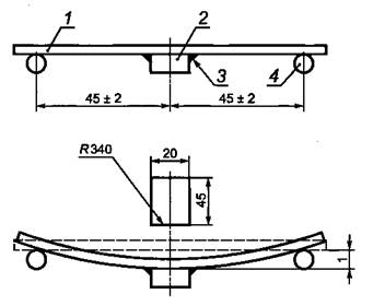 1 - стандартная разводка печатной платы; 2 - испытуемый образец; 3 - припой; 4 - опора Рисунок 5 - Зажимное устройство для изгиба плавких вставок для поверхностного монтажа