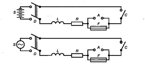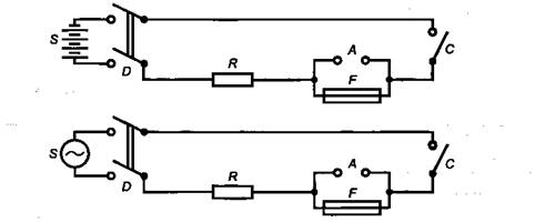 b) Испытательная схема для проверки отключающей способности плавких вставок с низкой отключающей способностью А - сменная вставка, используемая при калибровке; С - контактор, замыкающий цепь; D - выключатель для отключения источника питания; F- испытуемая вставка; S - источник питания, импеданс которого равен 10 % общего импеданса цепи; L - катушка индуктивности без железного сердечника; R - последовательно включенный резистор, отрегулированный для получения необходимого ожидаемого тока Рисунок 6 - Испытательные схемы для проверки отключающей способности плавких вставок 10 Технические условия10.1 ТУ 1 - Плавкие вставки для объемного монтажа