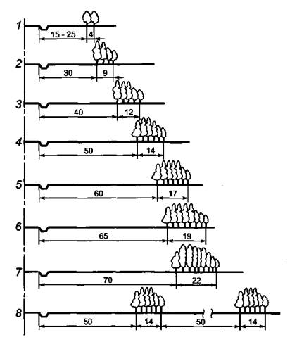 Объемы снегоприноса: 1 - 25 м3/м; 2 - 50 м3/м; 3 - 75 м3/м; 4 - 100 м3/м; 5 - 125 м3/м; 6 - 150 м3/м; 7 - 200 м3/м; 8 - 250 м3/м Рисунок 1 - Схемы снегозащитных насаждений для объемов снегоприноса до 300 м3/м