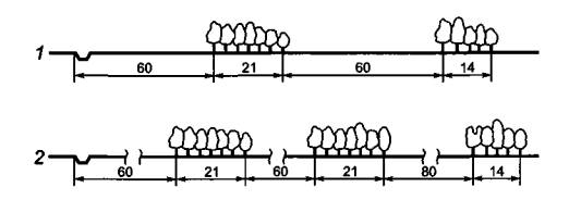 Объемы снегоприноса: 1 - 350 м3/м; 2 - 500 м3/м Рисунок 2 - Схемы снегозащитных насаждений для объемов снегоприноса более 300 м3/м 4.4.4.2 Снегозадерживающие заборы Снегозадерживающие заборы для защиты дорог от снега изготавливают и устанавливают с учетом объема снегоприноса. Заборы изготавливают однопанельными с просветностью решетки до 70 % и двухпанельными с просветностью решетки до 50 %. Однопанельные заборы в основном применяют для вторых и третьих рядов многорядных линий заборов, двухпанельные - при устройстве заборов в один ряд или в ближайшем к дороге ряду многорядных линий заборов. Заборы строят из дерева, сборного железобетона или других материалов. Необходимую высоту забора Н3 определяют по формуле
