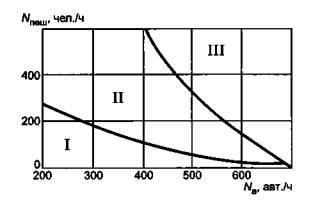 I - нерегулируемые наземные переходы; II - регулируемые наземные переходы; III - внеуличные переходы (надземные и подземные) Рисунок 3 - Условия применения пешеходных переходов различных видов 4.5.2.4 Пешеходные переходы должны быть оборудованы дорожными знаками, разметкой, а в случае возможности использования распределительных сетей - стационарным наружным освещением. На дорогах с шириной проезжей части 15 м и более наземные пешеходные переходы должны быть оборудованы островками безопасности в соответствии с 4.2.6. 4.5.2.5 На переходах со светофорным регулированием пешеходные светофоры могут быть дополнены цифровыми табло, показывающими время, оставшееся до включения разрешающего сигнала пешеходного светофора, а также звуковым сигналом, действующим во время горения разрешающего сигнала. 4.5.2.6 У наземных пешеходных переходов со светофорным регулированием должны быть установлены ограничивающие пешеходные ограждения перильного типа с двух сторон дороги на расстоянии не менее 50 м в обе стороны от пешеходного перехода. На дорогах с разделительной полосой в местах нахождения внеуличных пешеходных переходов (подземных и надземных) должны быть установлены ограничивающие пешеходные ограждения перильного типа или ограждения в виде сеток длиной не менее 20 м на разделительной полосе в обе стороны от пешеходного перехода (при отсутствии на разделительной полосе удерживающих ограждений для автомобилей). 4.5.3 Велосипедные дорожки 4.5.3.1 Велосипедные дорожки устраивают за пределами проезжей части дорог при соотношениях интенсивностей движения автомобилей и велосипедистов, указанных в таблице 3. Таблица 3