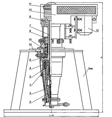 1 - ротор; 2 - шнек; 3 - питатель; 4 - тарелки сепарирующие; 5 - тарелкодержатель; 6 - диск напорный; 7 - вал ротора; 8 - опора ротора верхняя; 9 - опора ротора нижняя (демпфирующая); 10 - уплотнение торцовое; 11 - редуктор; 12 - электродвигатель; 13 - кожух привода; 14 - плита Рисунок 1 3.3 Требования назначенияЦентрифуги предназначены для разделения жидких неоднородных радиоактивных сред, содержащих мелкодисперсную твердую фазу. Конструкцией центрифуги должна быть обеспечена безопасность проведения работ, защита обслуживающего персонала и окружающей среды от радиоактивного воздействия. 3.4. Требования надежности3.4.1 Центрифуги должны быть надежными и безопасными в эксплуатации и доступными для обслуживания и ремонта. Для повышения безопасности рекомендуется размещать центрифуги под защитными плитами, в каньонах, камерах или боксах. 3.4.2 Центрифуги должны соответствовать следующим показателям надежности и долговечности: - средний ресурс до капитального ремонта - не менее 16000 ч; - средний срок службы - не менее пяти лет. 3.4.3 Значения показателей надежности могут быть уменьшены при переработке на центрифугах жидких неоднородных сред, содержащих абразивную твердую фазу, и (или) вызывающих коррозию основного материала со скоростью более 0,1 мм в год. 3.5 Требования к материалам3.5.1 Качества и свойства материалов для изготовления центрифуг должны соответствовать требованиям, указанным в КД и настоящем стандарте, и подтверждаться сертификатами заводов-поставщиков. 3.5.2 Центрифуги изготовляют из стали 12X18Н10Т по ГОСТ 5632-72. По соглашению между потребителем, проектировщиком и изготовителем допускается применять сталь других марок или материалы, механические свойства, коррозионная стойкость, виды и объемы испытаний которых не ниже указанных в настоящем стандарте. 3.5.3 Поковки из коррозионно-стойких сталей, предназначенные для изготовления вращающихся деталей, должны быть проверены на отсутствие внутренних дефектов методом ультразвуковой дефектоскопии (УЗД). Нормы допустимых дефектов - по ГОСТ 24507-80, группа качества 3п. 3.5.4 Заготовки из материалов аустенитного класса для изготовления основных деталей центрифуг (ротора, шнека, вала, тарелкодержателя и др.) при отсутствии в сертификате данных о способе термообработки должны быть подвергнуты аустенизации. После термообработки материал должен быть проверен на стойкость к межкристаллитной коррозии (МКК) по методу АМУ (испытание образцов в растворе серной кислоты и сернокислой меди в присутствии металлической меди) или АМУФ (испытание образцов в растворе серной кислоты и сернокислой меди в присутствии металлической меди и фтористого калия) по ГОСТ 6032-2003, решение о контроле механических свойств принимает конструктор. Приведенные требования должны быть указаны в КД. 3.6 Требования к покупным изделиям3.6.1 Покупные изделия, предназначенные для центрифуг, должны иметь сопроводительные документы: паспорт и ярлык отдела технического контроля (ОТК) завода - изготовителя центрифуг о приемке при входном контроле. 3.6.2 Входной контроль покупных изделий перед сборкой следует проводить в соответствии с инструкцией завода - изготовителя центрифуг. 3.7 Конструктивные требования3.7.1 Подшипниковые узлы должны иметь уплотнения, предотвращающие выброс перерабатываемого центрифугой продукта в окружающую среду. 3.7.2 Смазку по