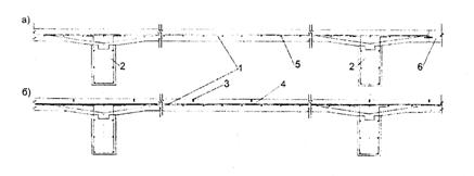 Рис. 1. Схема НАЦП (продольное сечение): а - бесшовное НАЦП; б - НАЦП с регулируемым процессом трещинообразования; 1 - непрерывная арматура; 2 - концевой анкер типа «ребра», количество которых устанавливается расчетом (обычно 3 шт. через 12 м); 3 - поперечные швы покрытия (через 4 - 5 м); 4 - участок арматуры с обмазкой битумом; 5 - поперечные стержни арматуры; 6 - примыкающее покрытие Экспериментальный участок дороги с таким покрытием протяженностью 400 м был построен в г. Аугсбурге. На этом участке уложены секции дорожной одежды с различными параметрами и характеристиками армирования: - толщина покрытия: 14; 16; 22 см; - арматурные сетки: а) диаметр проволоки 7,5 мм, ячейки размером 150×150 мм; б) диаметр продольной проволоки 8,5 мм и поперечной 7,5 мм; ячейки размером 150×150 мм; - арматурные стержни диаметром 20 мм, образующие ячейки размером 500×500 мм. Арматура установлена на уровне 1/3 толщины плиты в нижней зоне. Предел упругости стали более 55 кг/мм2. Процент армирования составил 0,3 - 0,5. Расстояние между упругими стыками 4,0 - 4,5 м. Пазы швов глубиной 45 мм (≈ 1/3 толщины плиты) нарезали через 1 - 2 дня после укладки смеси и заполняли мастикой или профилированным шнуром из неопрена. Арматурные стержни и сетки обмазывали пластичным материалом на расстоянии 60 см в каждую сторону от стыка. Бетонирование производили на всю толщину покрытия. Раскрытие швов во время эксплуатации было в пределах 0,7 - 1,0 мм. В Нидерландах конструкции с НАЦП становятся все более популярными и применяются при строительстве долговечных покрытий [37]. Возросший интерес к таким покрытиям привел к необходимости разработки практических руководств и рекомендаций по стандартизации конструкций, подготовке тендерных документов и строительству. В то время НАЦП рассматривались каждый раз как уникальный проект. В последующие 10 лет Министерство транспорта Нидерландов построило ряд дорожных участков с НАЦП с применением различных вариаций этого типа покрытий. Такое непрерывное развитие привело к явному улучшению эксплуатационных показателей цементобетонных покрытий. При рассмотрении как с технической, так и с коммерческой точек зрения бесшовные покрытия из непрерывно армированного цементобетона являются действительно привлекательным вариантом, особенно для автомагистралей, в связи с тем, что применение пористых асфальтобетонных слоев износа обязательно при сооружении главных дорог. При укладке таких слоев на цементобетонное покрытие со швами со временем швы будут отражаться через слой износа. Отмечаются следующие преимущества НАЦП. - Вследствие высокой степени непрерывности покрытий (имеющих небольшую ширину раскрытия трещин из-за хорошей передачи нагрузки), на них не будут проявляться специфические кромочные условия плит со швами. - Благодаря большей долговечности, простоте и эффективности конструкций НАЦП облегчается процесс строительства. Стоимость строительства можно поддерживать в приемлемых и конкурентоспособных пределах. - Так как в таких покрытиях отсутствуют швы, повышается комфортность движения. - «Встроенная» гибкость наряду с однородным распределением нагрузки по сечению позволяет преодолевать умеренные неравномерные осадки. - На слой НАЦП можно укладывать слой пористого асфальтобетона (слой износа), который обеспечивает низкий уровень шума и хорошую видимость из-за отс
