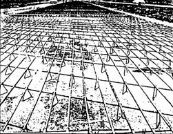 Рис. 2. Участок автомобильной дороги с установленной непрерывной арматурой, подготовленный к бетонированию Продольный строительный шов В зависимости от ширины и имеющегося рабочего пространства не всегда возможно уложить НАЦП по всей ширине. Не является обычной укладка покрытия двумя или несколькими отдельными полосами. Шов необходим, когда полоса покрытия укладывается или когда ее добавляют к ряду существующих участков покрытия. Такой шов называется строительным швом. Продольный и строительный швы устраиваются в виде прямого вертикального шва. Связующие стержни, работающие на растяжение, имеют одинаковый диаметр 12 мм с поперечными стержнями и длину 800 мм. Эти стержни укладывают с интервалом 1000 мм друг от друга в шве между двумя полосами движения на съездах-въездах и между твердой обочиной. Связующие стержни укладывают в свежеуложенный бетон секции, бетонируемой первой, или вставляют в просверленные отверстия, предварительно обмазав их цементным раствором. Развитие трещин предотвращается благодаря равномерному распределению напряжений. Связующие стержни покрываются в средней части синтетическим покрытием во избежание коррозии. Таким образом достигается оптимальное сцепление и предотвращается сдвиг. Продольный шов герметизируется битумным наполнителем или герметиком. Продольный шов сжатия Когда ширина бетонирования больше 5 м, необходимо устраивать шов сжатия. Устройство продольного усадочного шва предпочтительнее строительного шва, так как этот тип шва менее подвержен разрушению и, следовательно, требует меньшего содержания. По этой причине его рекомендуют в случае бетонирования больших площадей покрытия. Такой шов может быть пропилен в затвердевшем бетоне или он образуется при бетонировании путем закладывания синтетической прокладки. Поперечный строительный шов При окончании дневной работы или перерыве на несколько часов необходимо устраивать поперечный строительный шов. В этот шов не укладывается какая-либо арматура. Установлены следующие требования для устройства этого типа шва: - продольная арматура должна быть целой и непрерывной; - поперечная арматура должна быть непрерывной; - шов должен быть устроен перпендикулярно направлению бетонирования; - шов должен устраиваться вертикально относительно дорожной поверхности. Методы строительства В Нидерландах бетонирование на ширину одной проезжей части с пропиленными или прорезанными продольными усадочными швами [37] считают предпочтительнее бетонирования двух отдельных полос движения с продольным строительным швом между ними. Так как арматура укладывается до начала работы укладчика, а отделка свежеуложенного бетона производится после его прохода, то бетонная смесь подается через боковой питатель. Вдоль места строительства новой дороги необходимо предусмотреть дорогу для движения построечного транспорта. Если такой дороги нет, то укладку следует производить в две полосы. За несколько дней до устройства НАЦП бетонируют анкерные балки, которые размещают под покрытие. Преимуществом такого способа является то, что эта полоса может быть использована как рабочая подъездная дорога. При строительстве НАЦП возникают проблемы, отличные от проблем при строительстве асфальтобетонных покрытий. Так, например, изменения поперечного профиля, таки
