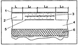 Рис. 4. Поперечный разрез дорожной одежды со слоем НАЦП: 1 - тонкий слой износа; 2 - плотный (горячий) асфальтобетон; 3 - плита непрерывно армированного цементобетона; 4 - существующее неармированное цементобетонное покрытие; 5 - выравнивающий щебеночно-мастичный слой; 6 - основание; L, L1, L2, L3 - длина соответственно обочины, первой, второй и третьей полос Поскольку НАЦП проектируется без поперечных швов, для преодоления температурного расширения покрытия необходимо устраивать анкер в конце каждой плиты. Участок реконструкции имел слабое земляное полотно, поэтому была применена специальная конструкция анкера в виде широкой стальной балки с фланцами, разработанная исследовательской лабораторией (рис. 5) [40].