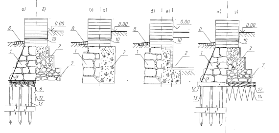 Рис. 2 Рис. 2 (а-в) иллюстрирует устройство расширяющих обойм, рис. 2г - применение банкетов, с предварительным обжатием грунта под подошвой уширяющей части. В ряде случаев увеличение площади опирания фундаментов может быть достигнуто подводкой монолитных железобетонных плит различных конструкций под всей или частью площади здания. Все рассмотренные выше способы усиления фундаментов применяются достаточно широко до настоящего времени, особенно в реставрационной практике, несмотря на ряд существенных отрицательных моментов, связанных с низкой эффективностью такого усиления и производством работ при его реализации. К таким моментам можно отнести большой объем земляных работ по откопке усиляемых фундаментов, часто выполняемых вручную, причем, во избежание развития дополнительных деформаций усиляемых зданий, эти работы должны выполняться захватками определенной длины. Бетонирование обойм, банкетов и подводка лежней под подошву усиляемого фундамента также выполняется вручную; необходимость предварительного обжатия грунтов основания под уширяющими элементами для включения их в работу фундамента, что, как правило, в силу как объективных, так и субъективных причин, качественно выполнить не представляется возможным; невозможность выполнить усиление этими способами при высоком уровне подземных вод, сезонные ограничения производства работ, позволяющие их проведение только при общих положительных температурах наружного воздуха, и, наконец, необходимость изменения конструкций существующих фундаментов и их внешнего вида при усилении, что недопустимо при реставрации памятников архитектуры, так как фундаменты являются их неотъемлемым элементом и также могут рассматриваться как памятники инженерного искусства. Перечисленные недостатки рассмотренных способов усиления фундаментов практически сводят к минимуму возможный положительный эффект их применения. При современном подходе к решению проблемы увеличения несущей способности фундаментов реконструируемых и реставрируемых зданий старой постройки эти методы, за редким исключением, являются анахронизмом, который может быть объяснен лишь отсутствием необходимой техники и оборудования для применения современных способов и конструкций усиления, получивших широкое распространение в мировой практике (9, 10, 13). 4. Современные методы усиления фундаментов.В практике реконструкции и реставрации в настоящее время находят применение как методы усиления фундаментов, базирующиеся на традиционных, так и принципиально новые, разработанные в течение последних 50 лет. Все эти методы рассчитаны на высокую степень механизации работ, при сведении к минимуму ручного труда, и новые технологии. Далее рассмотрены некоторые из многочисленных способов усиления. На рис.3 представлены способы усиления фундаментов, представляющие собой развитие традиционных схем, с применением современных материалов и технологий.