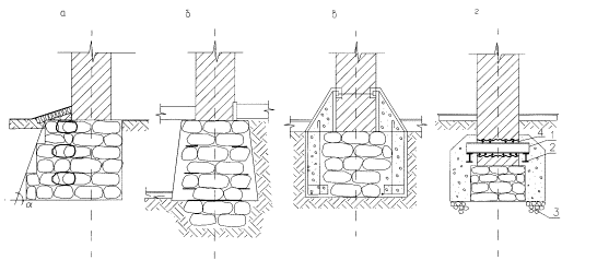 Рис. 1 При проведении обследования состояния зданий старой постройки во многих случаях наблюдаются различные дефекты и разрушения в кладке фундаментов, связанные с деформациями основания и, прежде всего, с неравномерными осадками, влияние которых сказывается на состоянии здания в целом (11, 12). Причины таких деформаций многообразны, и в частности: погрешность в оценке несущей способности грунтов основания вследствие ошибочной интерпретации данных при определении свойств грунтов, особенно таких как просадочные, пучинистые, набухающие и др.; просчеты в выборе конструкции фундаментов, их размеров и глубины заложения; отсутствие деформационных швов на стыках разнонагруженных частей зданий; изменение прочностных характеристик грунтов вследствие изменения их влажности, например, при отсутствии или нарушениях вертикальной планировки, нарушении поверхностного водоотвода и дренажных систем; разру3ения кладки фундаментов под воздействием агрессивных грунтовых вод; гниение деревянных конструкций фундаментов при изменении положения или колебаниях уровня подземных вод; увеличение нагрузок на фундаменты в здании в целом или в отдельных его частях за счет надстроек и перестроек; систематическая откачка вод из подвальных помещений, вызывающая ослабление грунтов основания при их суффозии; устройство различных раскопов рядом с существующим зданием; понижение пола подвального помещения; использование некачественного материала при устройстве фундаментов; воздействие природных и климатических факторов, например многократного замораживания и размораживания переувлажненной кладки фундаментов в пределах глубины промерзания и многих других причин и их сочетаний (10, 12). По данным МосжилНИИпроекта износ фундаментов зданий идет интенсивно в первые 20-30 лет эксплуатации и затем после 90-100 лет службы здания. Вместе с тем, в последнее время отмечается увеличение интенсивности разрушения конструкций фундаментов старых зданий, которое связывается с увеличением динамического воздействия за счет интенсификации движения транспорта, вибрации механизмов и ударных нагрузок промышленного оборудования, строительства рядом с существующими зданиями новых с использованием забивки свай или шпунта, строительства подземных сооружений метрополитена и прокладки городских коммуникаций, резкого возрастания степени агрессивности подземных вод (1, 3). Таким образом, при выборе способа усиления фундаментов существующего здания должно быть учтено все многообразие факторов, влияющих на их состояние и выбран такой способ усиления, который смог бы нейтрализовать или свести к минимуму воздействие неблагоприятных факторов и способствовать надежной и длительной эксплуатации реконструируемого или реставрируемого здания или сооружения. 3. Традиционные способы усиления фундаментов.Усиление фундаментов существующих зданий применяется так же давно, как и само строительство. Методы и способы усиления до середины текущего столетия были столь же традиционны, как и конструкции фундаментов. Изменения происходили лишь в части применяемых материалов и преследовали главную цель - наряду с восстановлением прочности кладки, увеличение площади опирания существующих фундаментов, снижение удельных величин давления от сооружения на грунт и уменьшение ве