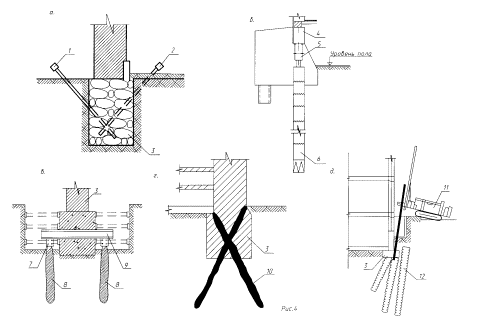 Рис. 3 На рис. 3а показано увеличение площади опирания усиляемых фундаментов с помощью обойм по методу Н.И. Страбахина. Он заключается в установке с обеих сторон усиляемого фундамента сборных железобетонных блоков, нижняя часть которых стянута анкерами, пропущенными через существующий фундамент и блоки усиления. В верхней части блоки разжимают забивными клиньями или домкратами, в результате чего блоки, поворачиваясь вокруг нижней точки, в уровне закрепления анкеров, обжимают грунт под подошвой блоков. После обжатия грунтов основания щели между существующим фундаментов и блоками усиления заполняют бетонной смесью. Рассмотренный способ имеет присущие традиционным способам усиления недостатки, требует выполнения значительного объема земляных работ и ручного труда, однако более надежен, так как позволяет выполнить обжатие грунтов основания под подошвой уширяемой части фундаментов и тем самым способствовать включению их в работу уже в процессе выполнения усиления. На рис. 3б, в представлены способы увеличения площади опирания существующих фундаментов. Их применение позволяет свести к минимуму земляные работы, которые сводятся к устройству песчано-гравийной подушки толщиной 40-60см, отсыпаемой с уплотнением взамен насыпных грунтов в пределах площади уширяющих элементов. Суть способа состоит в устройстве в уровне отметки земли, пола 1-го этажа или подвала консольной железобетонной конструкции, заанкеренной в кладку несущей стены здания и позволяющей увеличить площадь опирания фундаментов, воспринимающего нагрузку от существующего здания. Применение рассматриваемого способа позволяет совмещать конструкцию усиления с отмостками здания, полами 1-го этажа или подвала. Элементы конструкции усиления выполняются в монолитном, сборно-монолитном и сборном железобетоне с армированием жесткой арматурой. В ряде случаев, при значительном вылете консоли конструкции усиления, целесообразно ее применение в сочетании с предварительно напряженным анкером, заделываемым в тело существующего фундамента (рис. 3в). Отверстия для анкерования конструкций усиления в несущие стены, опоры и фундаменты реконструируемого здания выполняются буровым способом с использованием стандартного бурового оборудования. Производство работ ведется с применением различных механизмом, ручной труд используется минимально. Рассмотренные способы предложены автором (6). Аналогичным образом решается задача увеличения площади опирания фундаментов существующего здания с помощью фундаментных плит по способу ЦНИИСК им. Кучеренко (рис. 3г), (1). Сборные железобетонные плиты дополнительного фундамента укладывают на уплотненную щебеночную подготовку. Плиты располагаются рядами в виде лент, уложенных в направлении продольной оси здания. По ним выполняют монолитную железобетонную конструкцию нажимных рам, которые состоят из нижних горизонтальных ригелей сечением 40×60см и наклонных стоек-упоров такого же сечения. Рамы передают усилия на пояса-обвязки поперечных стен, устраиваемые в их кладке. Для образования замкнутого контура нажимных рам, над ними, в плоскости перекрытия, выполняют монолитные железобетонные участки в виде полос шириной 60см и высотой, равной толщине плит перекрытий. Рис. 4 Другая группа методов служит для усиления конструкций существую